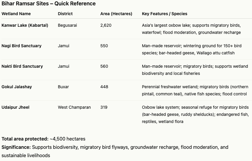 These two wetlands join Bihar’s three existing Ramsar sites — Kanwar Lake (Kabartal) in Begusarai district, designated in 2020 as Asia’s largest oxbow lake with an area of about 2,620 hectares, and Nagi and Nakti Bird Sanctuaries in Jamui district, listed in 2024 with a combined area of over 1,100 hectares. Nagi and Nakti are man-made reservoirs that have become key wintering grounds for over 150 bird species, including the vulnerable Wallago attu catfish and the globally important bar-headed goose. Together, Bihar’s five Ramsar sites now protect approximately 4,500 hectares of wetlands, contributing significantly to the Central Asian Flyway, which is used by migratory birds linking Siberia, Central Asia, and the Indian subcontinent.