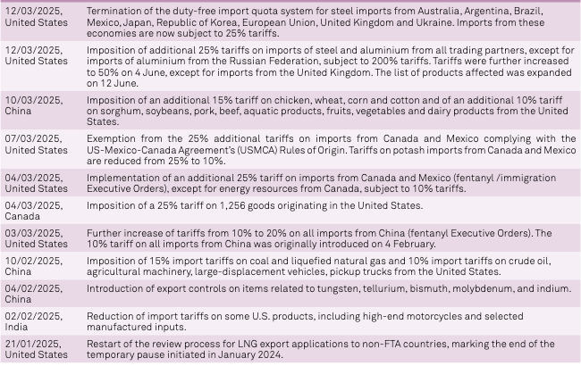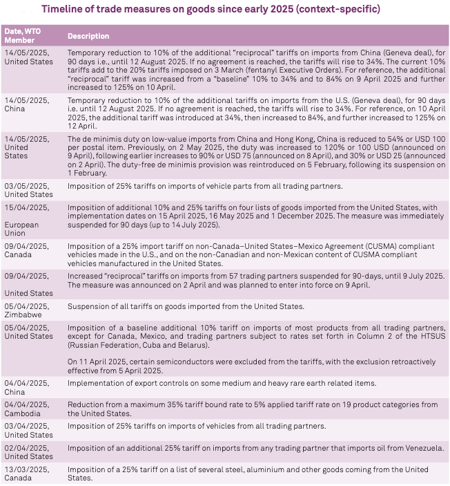 Trade-facilitating measures totaled 207 (32.1 percent of total measures), averaging 29.6 per month, the second-highest since 2014, primarily import tariff reductions and relaxed quantitative restrictions, covering 1,038.6 billion dollars (895.9 billion dollars for imports, 3.6 percent of world imports; 142.7 billion dollars for exports, 0.6 percent), down from 1,440.4 billion dollars (1,320.4 billion dollars for imports, 120.0 billion dollars for exports). In the services sector, 34 members and four observers adopted 69 measures, a significant decrease from 2024, mostly liberalising conditions for service suppliers or enhancing regulatory frameworks, demonstrating a commitment to services trade despite the challenging environment. Economic support measures, including subsidies, stimulus packages, state aid, and export incentives, shifted since April 2025 from direct support to regulatory tools targeting climate change mitigation, supply security, and national security. Following the Director-General’s request for information on March 5, 2025, 34 members reported 100 measures, down from 224 in 2024. The Secretariat’s research, complemented by external data from the Global Trade Alert (GTA), indicates additional unreported support measures with trade implications, highlighting the evolving focus on strategic policy objectives beyond traditional economic goals.