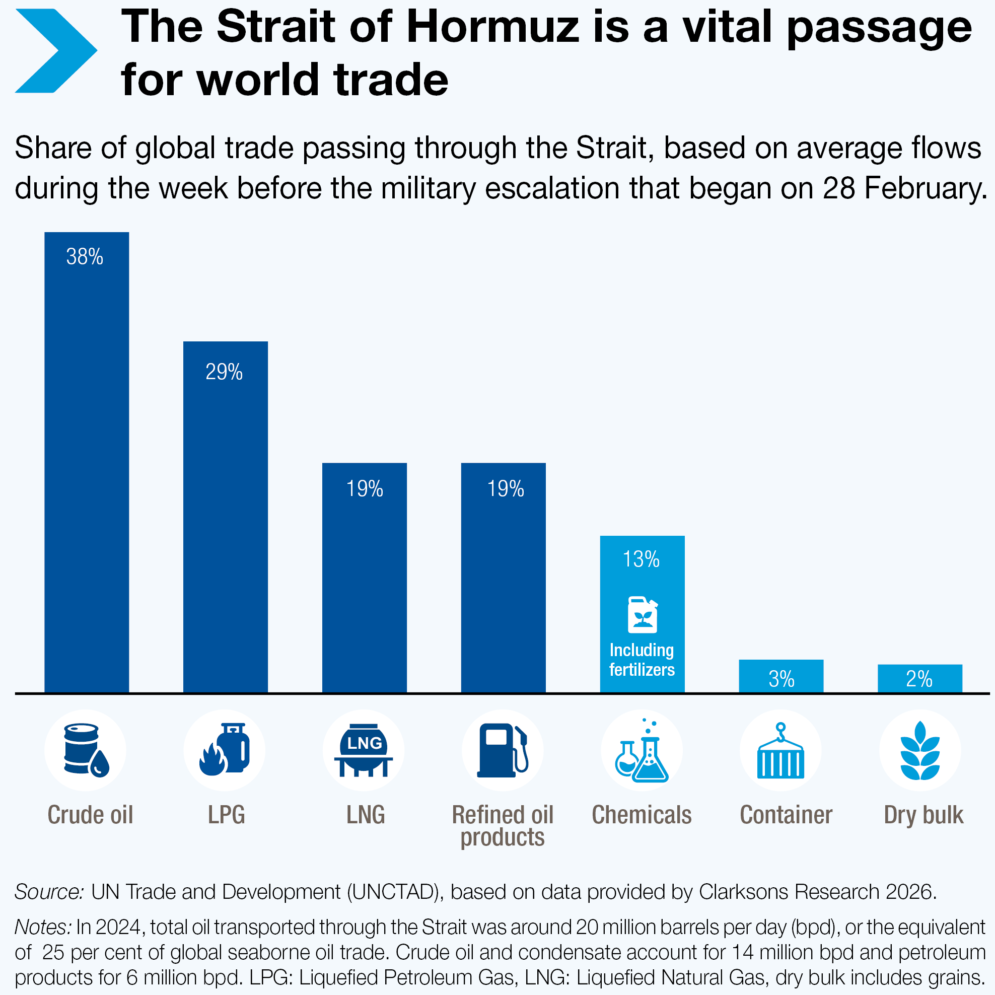 Shipping through the Strait has effectively collapsed, with vessel transits down by more than 95%. Data compiled by UNCTAD, based on Clarksons Research Shipping Intelligence Network, show that daily ship transits fell from an average of 103 vessels in the last week of February to single digits within weeks, bringing flows close to a standstill. Over the period from 1 to 27 February, average daily transits stood at 129 vessels, before dropping sharply to as low as three to six vessels per day in early March.