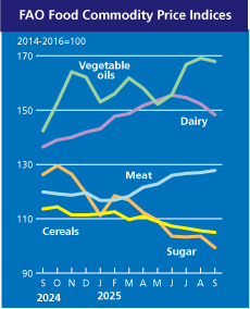 The FAO Food Price Index, which tracks monthly changes in international prices of a basket of globally traded food commodities, averaged 128.8 points in September, down slightly from a revised 129.7 points in August. This represents a 3.4 per cent increase from September 2024 but remains 19.6 per cent below its peak in March 2022. A 4.1 per cent drop led the decline in the FAO Sugar Price Index, which fell to 99.4 points, its lowest since March 2021, driven by higher-than-expected sugar production in Brazil and favourable harvest prospects in India and Thailand due to ample monsoon rains and expanded plantings.