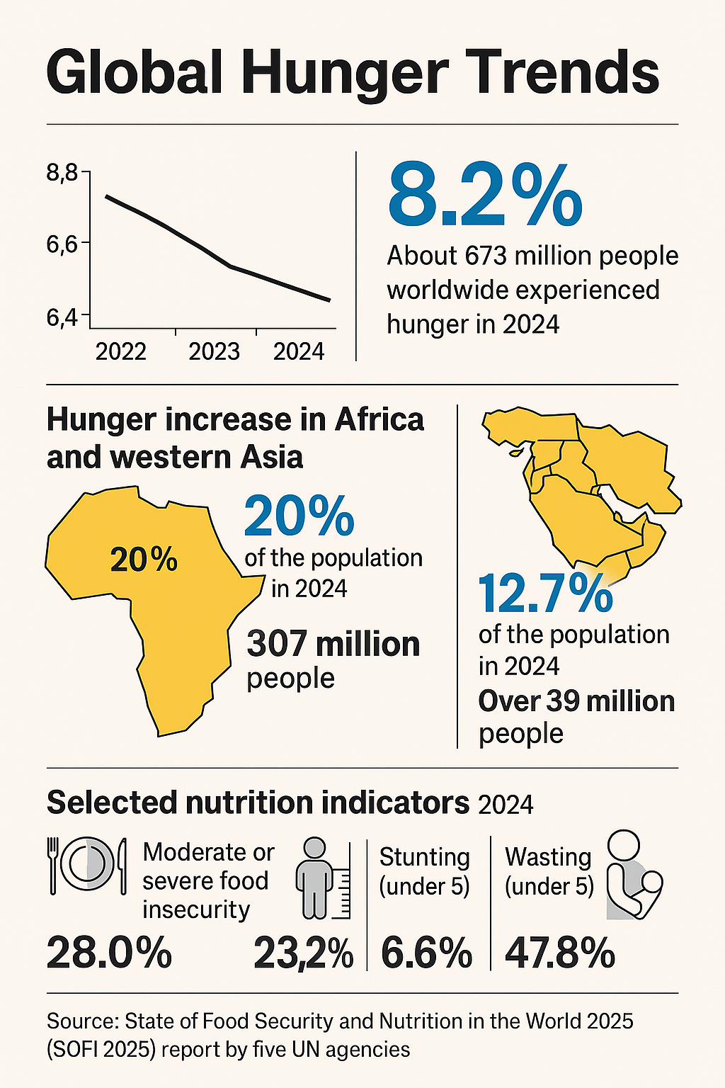 Addis Ababa: Global hunger rates have modestly declined for the second consecutive year, with an estimated 8.2 per cent of the world’s population — about 673 million people — experiencing hunger in 2024. This marks an improvement from 8.5 per cent in 2023 and 8.7 per cent in 2022. However, the overall progress masks widening disparities, as hunger has risen alarmingly across most subregions of Africa and Western Asia, according to the State of Food Security and Nutrition in the World (SOFI) 2025 report launched today in Addis Ababa during the Second United Nations Food Systems Summit Stocktake (UNFSS+4).