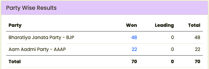The Delhi Election Result. Saffron represents the BJP. Blue represents the AAP.