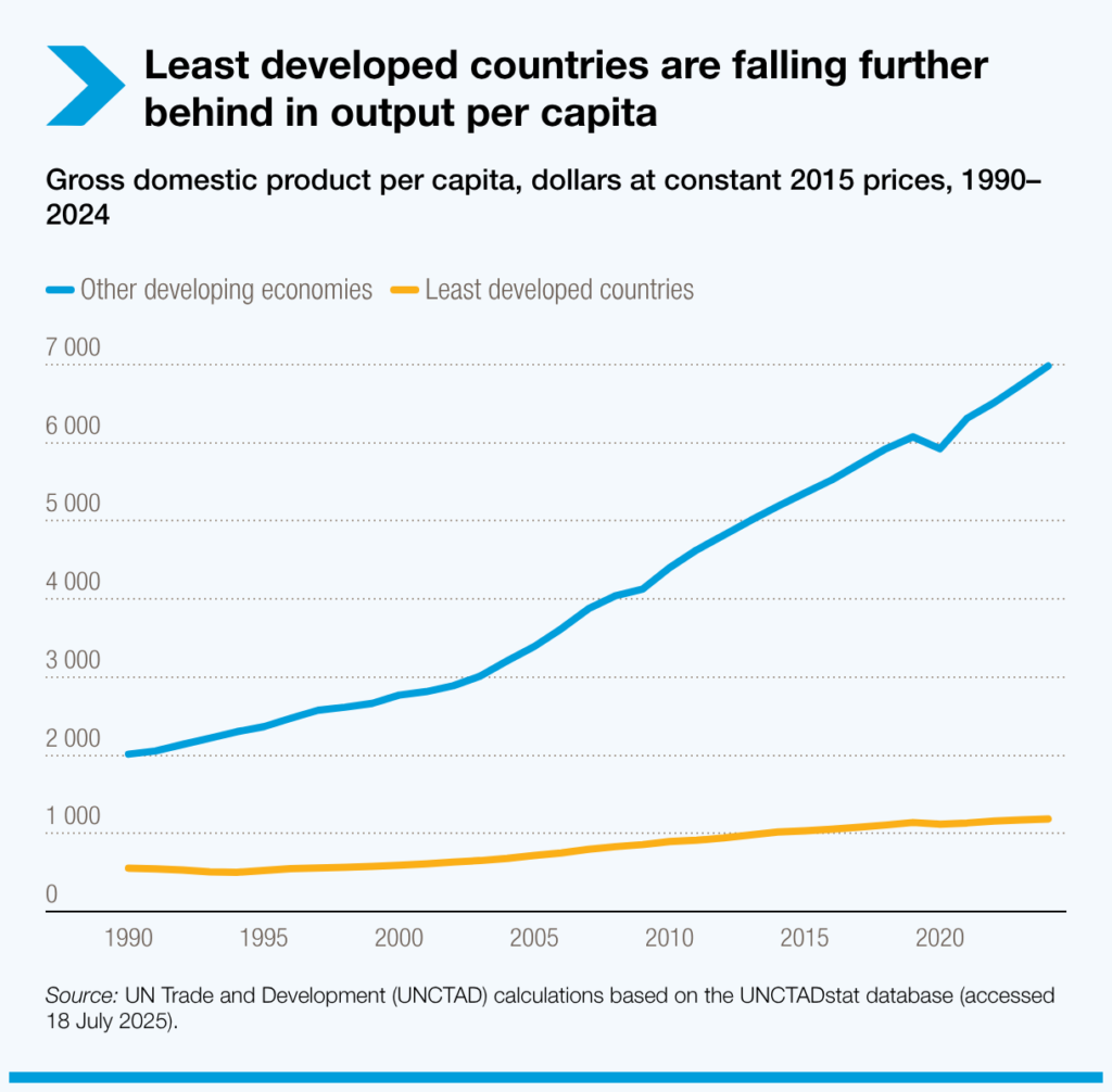 Despite the growing role of services, average per capita economic growth in LDCs remained sluggish in 2024, reinforcing concerns that services-led growth is not closing the income gap with more advanced economies. Output per capita in LDCs continues to fall further behind that of other developing and developed countries, reflecting deep structural constraints.