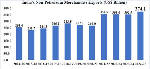 Merchandise exports, excluding petroleum products, rose to $374.1 billion, a 6.0% increase from $352.9 billion in 2023-24, marking the highest annual non-petroleum merchandise exports recorded.