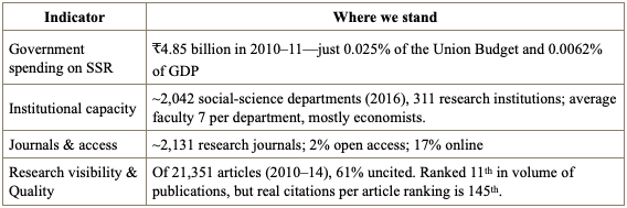 The table below mentions a few telling indicators, drawn from the first comprehensive, empirical exercise undertaken by the Indian Council of Social Science Research (ICSSR) on the state of social science research and policy in India since independence- published by Oxford University Press in 2017- which this author had the honour of co-editing. This study was a result of collaboration among 31 senior researchers, drawn from ICSSR institutes across 8 states and was guided by the National Advisory Panel of 12 eminent social scientists. This was a truly multi-disciplinary exercise; the researchers were drawn from more than 10 disciplines.
