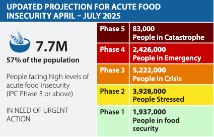 Juba, South Sudan: Conflict, displacement, and disease are driving food insecurity and malnutrition to alarming levels in South Sudan, with Nasir and Ulang counties in Upper Nile state at risk of famine in the coming months. The impact of conflict and civil insecurity is exacerbating food insecurity, with an estimated 7.7 million people—57 per cent of the population—facing high levels of acute food insecurity (Integrated Food Security Phase Classification Acute Food Insecurity – IPC AFI Phase 3 or above, Crisis or worse) during the lean season projection period of April–July 2025. Among them, about 83,000 people (almost 1 percent of the population analyzed) are expected to experience catastrophic hunger (IPC AFI Phase 5) in several areas: 12,000 people in Pibor County of Greater Pibor Administrative Area; 15,000 in Luakpiny/Nasir, 7,000 in Ulang, and 10,000 in Malakal counties of Upper Nile State; and 39,000 people returning to South Sudan after fleeing conflict in Sudan. Additionally, 2.4 million people (18 per cent of the population analysed) are facing emergency levels (IPC AFI Phase 4), and 5.2 million (38 per cent) are in crisis levels (IPC AFI Phase 3).