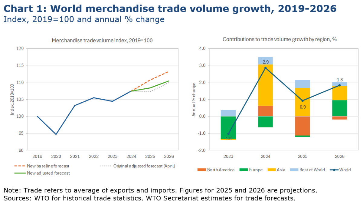 The -0.2% projected trade contraction for 2025 in the April forecast was based on measures in place at that time (14 April), including the suspension of “reciprocal” tariffs by the United States. Subsequent US agreements with China and the United Kingdom raised the forecast for the year to 0.3%, but higher tariffs on steel and aluminium later brought it back down to 0.1%. The current 0.9% growth forecast reflects the positive tailwinds from frontloading, inventory accumulation, and an improved macroeconomic climate, balanced against the negative impact of tariffs. The WTO remains committed to monitoring these developments and working with members to mitigate risks, as tariffs pose increasing challenges for global trade stability in 2026.
