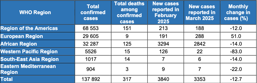 The report noted that the Democratic Republic of the Congo has the highest cumulative mpox cases in Africa for 2025, although recent weeks have seen a decline in reported cases, likely due to reduced testing capabilities. Clades Ia and Ib MPXV remain active in the region.