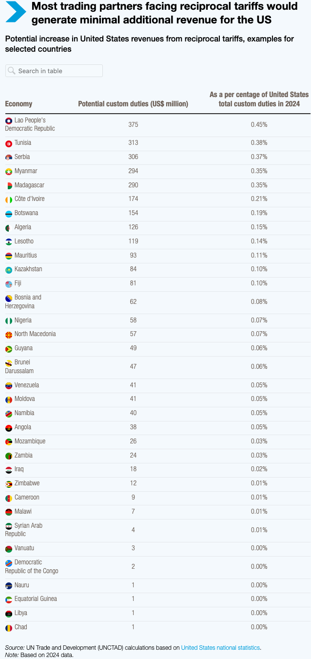UNCTAD’s report, “Escalating tariffs: The impact on small and vulnerable economies,” released today, highlights that 28 of the 57 affected countries contribute less than 0.1% to the US trade deficit. Imposing tariffs on these nations, including 11 least developed countries, would generate minimal revenue for the US while severely limiting their export capabilities. For 36 countries, the tariffs would add less than 1% to current US tariff revenues, even if import volumes remain unchanged.