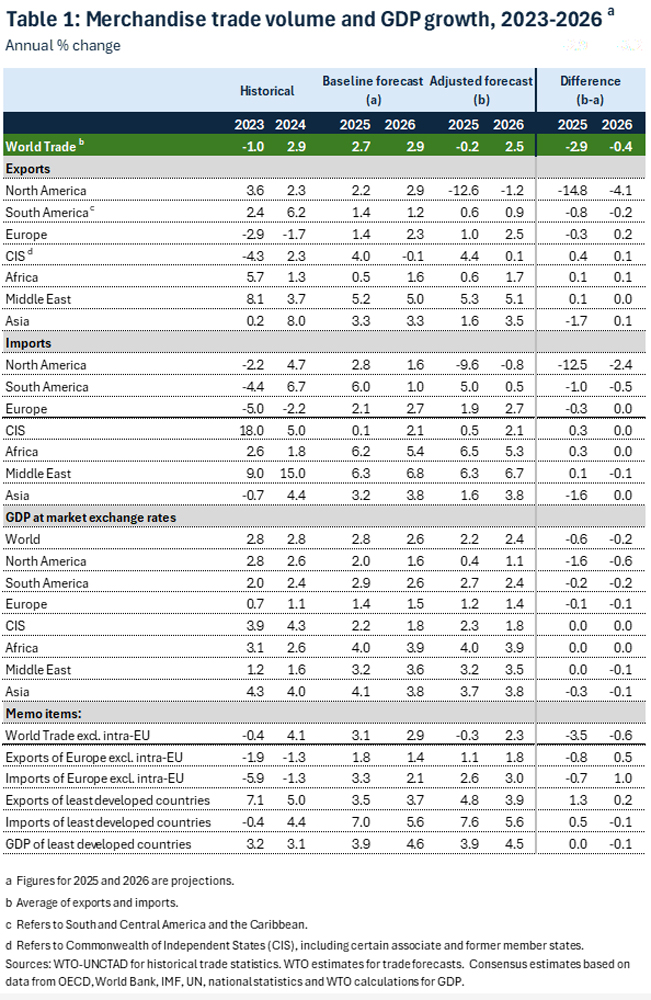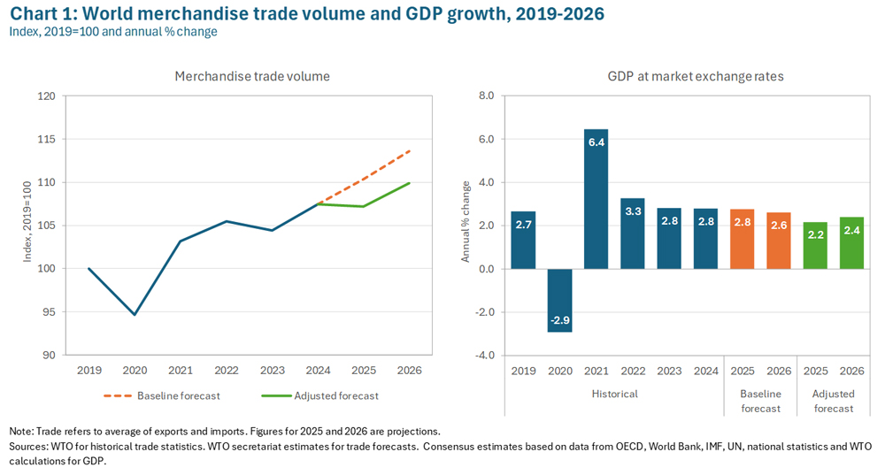 At the start of 2025, the WTO Secretariat expected continued expansion of world trade, with merchandise trade growing in line with world GDP and commercial services trade increasing at a faster pace. However, a large number of new tariffs introduced since January prompted WTO economists to reassess the trade situation, resulting in a substantial downgrade to the merchandise trade forecast and a smaller reduction for services trade. In 2024, merchandise trade volume grew 2.9%, outpacing global GDP growth of 2.8%, marking the first year since 2017 (excluding the COVID-19 rebound) where trade grew faster than output.