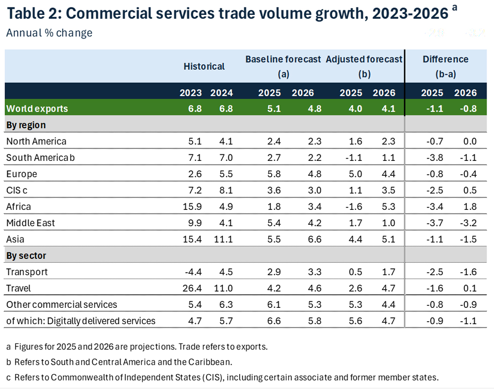 Regional services trade forecasts show Europe leading with 5.0% export growth in 2025, continuing at 4.4% in 2026. Asia’s services exports are projected to grow by 4.4% in 2025 and 5.1% in 2026. North America’s growth slows to 1.6% in 2025 but rises to 2.3% in 2026. The Middle East expects 1.7% growth in 2025 and 1.0% in 2026, while the Commonwealth of Independent States (CIS) anticipates 1.1% in 2025 and 3.5% in 2026. Africa and South and Central America, including the Caribbean, are forecast to record declines in services exports in 2025.